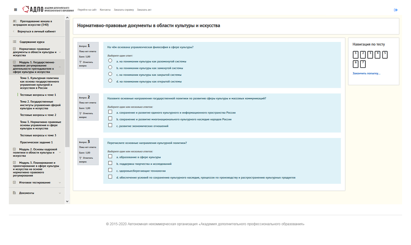 Весь учебный материал разбит на модули и представлен в виде лекций. После каждой темы добавлены тестовые задания для самопроверки. Чтобы перейти к следующему разделу, необходимо пройти итоговый тест по текущему модулю. Такой формат помогает постепенно осваивать материал и закреплять знания на каждом этапе обучения.