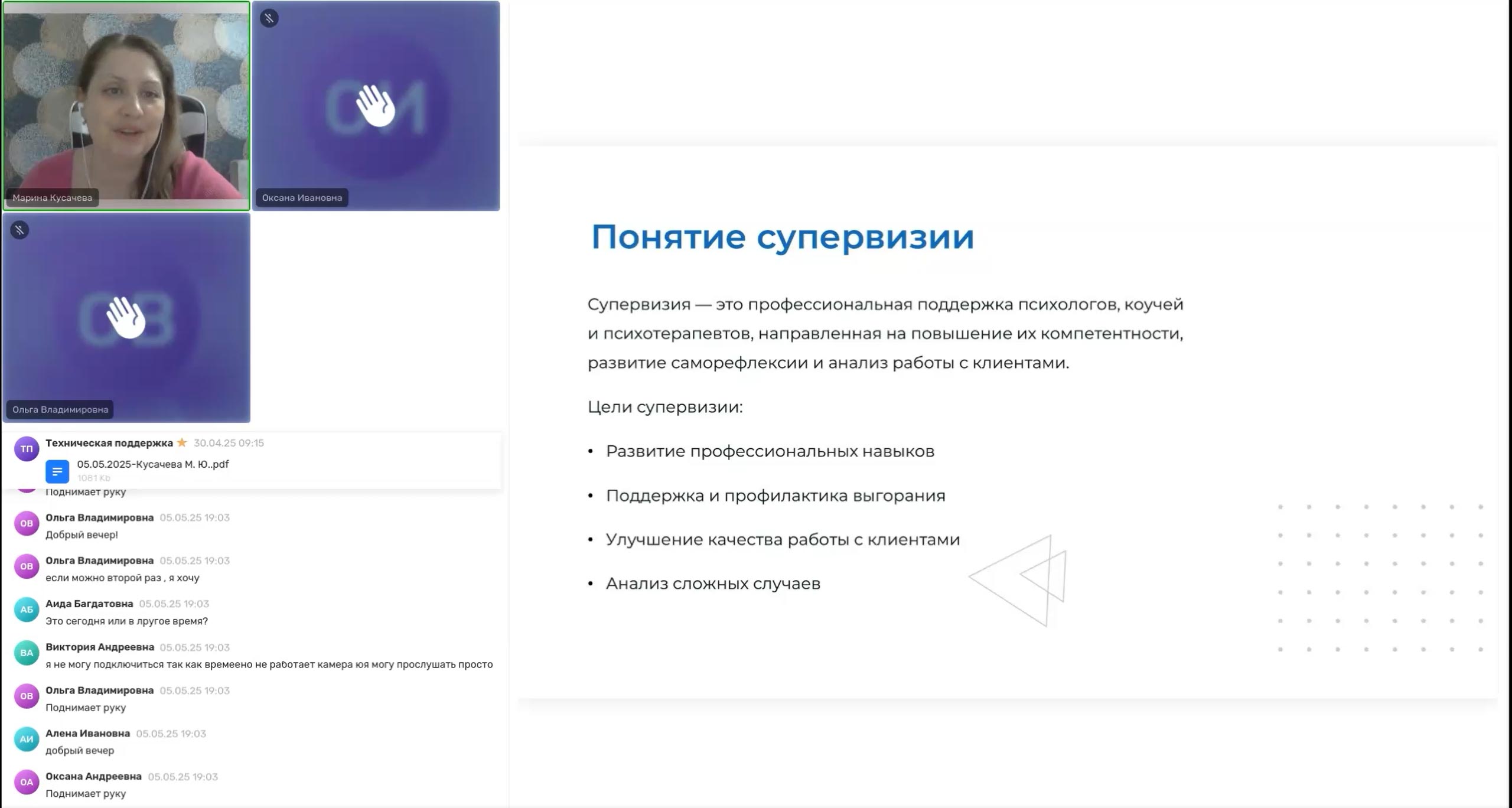 Для обучающихся программ по психологии и логопедии раз в месяц проходят групповые супервизии. На этих встречах с практикующими экспертами можно обсудить реальные ситуации из практики, задать вопросы и получить рекомендации по работе с клиентами.